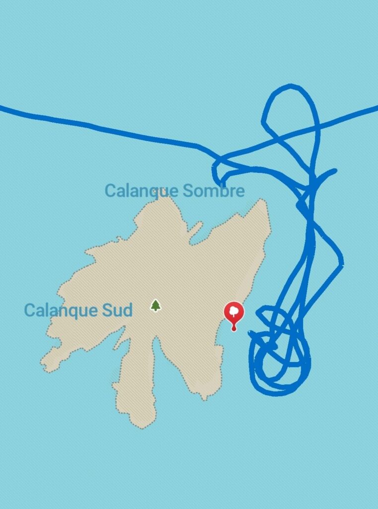 Le bateau nous récupère dans la calanque sombre, au bord de l’île.